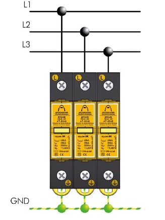 Single-pole. Type 1+2. Uc = 275 VAC. Iimp = 15 kA. Imax =65 kA. Up(In) = 1600 V. Up(1,2/50) = 900 V, size 1DIN.