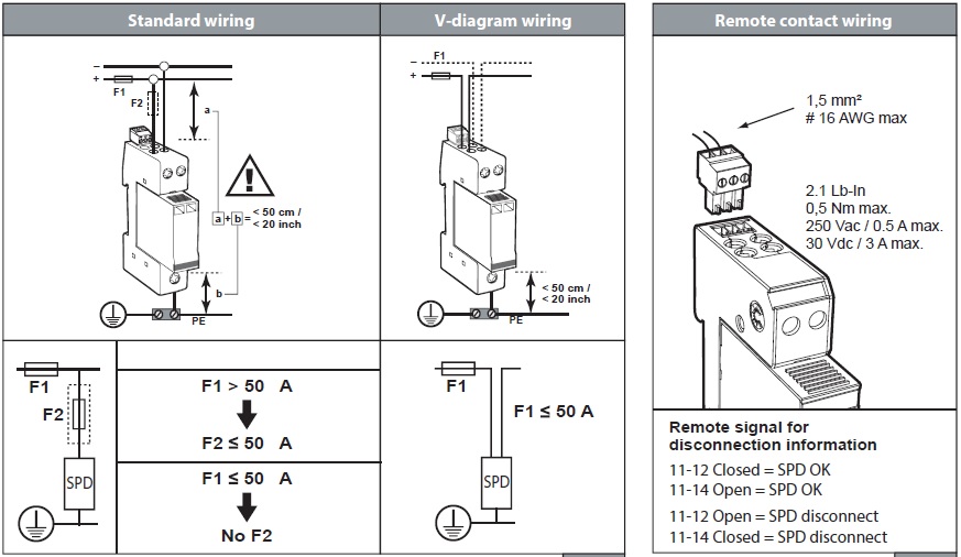 - The total length of parallel connection wires to DC network must be lower than 0.5 m in order not to increase the protection level (Up) provided by the SPD.