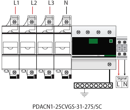 PDACN1-25CVGS-31-275/SC thuộc nhóm thiết bị type 1, type 2 và cả type 3 theo chuẩn IEC, không có dòng rò và dòng phóng theo, chịu ngắn mạch 50kA; có khả năng triệt tiêu các xung quá áp lan truyền (8/20us) đến 100kA và xung trực tiếp (10/350us) đến 25kA trên mỗi cực P (mỗi cực kết nối với mỗi đường dây pha hoặc trung tính).