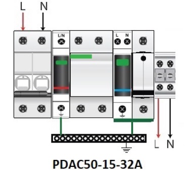 Tủ chống sét PDAC50-15-32A được thiết kế lắp đặt hoàn chỉnh trong tủ nhựa, đấu nối tiếp với hệ thống điện tải tối đa 32A, thông qua thiết bị bảo vệ ngắn mạch như cầu chì hoặc CB, khoảng cách dây kết nối càng ngắn càng tốt (tối đa 50cm) để đảm bảo hiệu quả.