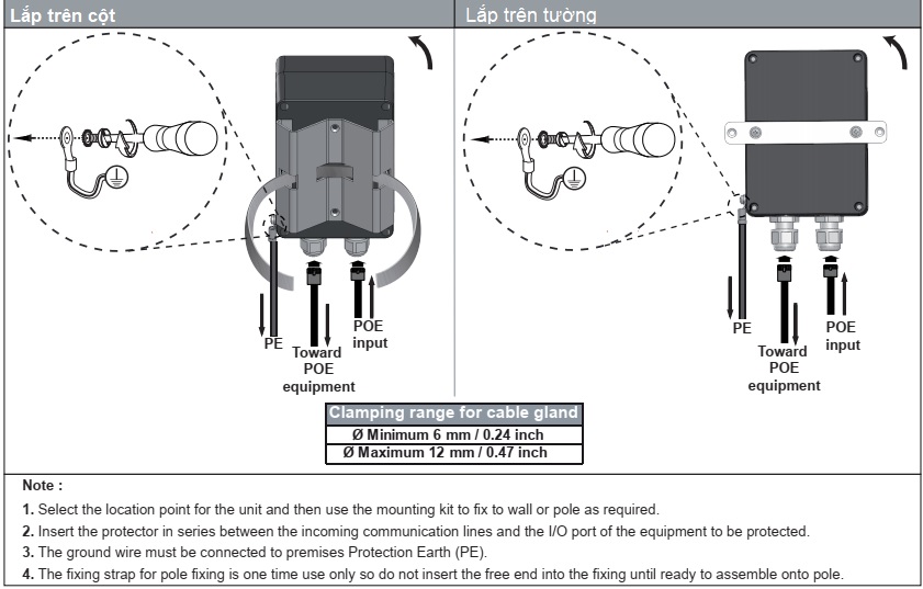 Bộ chống sét PoE ngoài trời này có cấu tạo đặc biệt để lắp bên ngoài với vỏ nhôm chịu được các điều kiện thời tiết khắc nghiệt, có thể lắp trên trụ tròn hoặc treo tường, khả năng cắt xung định mức 2kA (xung 8/20us) cho mỗi dây với đất, đặc biệt còn chịu được dạng xung trực tiếp 10/350us là 500A. Đáp ứng cho dòng tải 2A, công suất 90W. Kết nối vào ra bằng RJ45 rất tiện dụng.